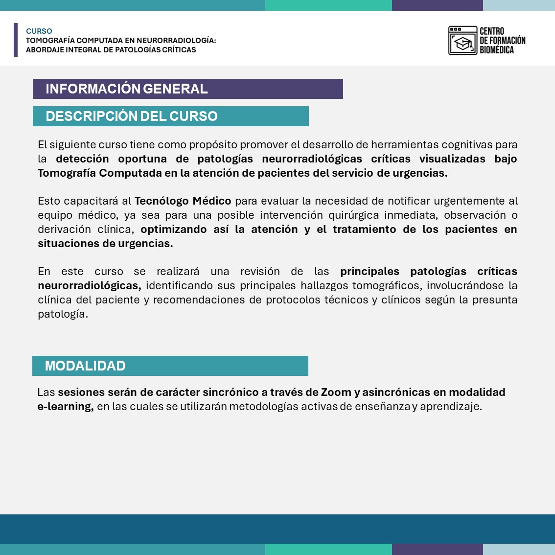 El siguiente curso tiene como propósito promover el desarrollo de herramientas cognitivas para la detección oportuna de patologías neurorradiológicas críticas visualizadas bajo Tomografía Computada en la atención de pacientes del servicio de urgencias.