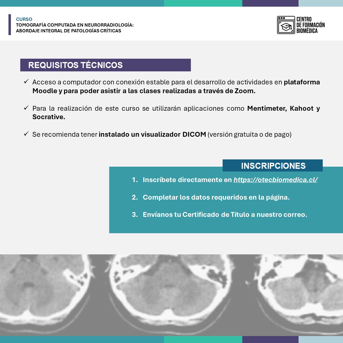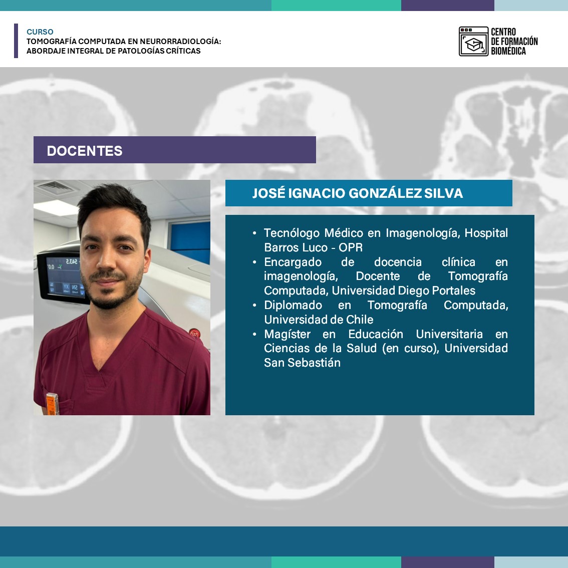 - El programa está dirigido a profesionales Tecnólogos Médicos con mención en Imagenología y Física Médica interesados en el desarrollo de competencias para desempeñarse en centros de salud públicos y privados que cuenten con Tomografía Computada o estén en vías de capacitación para desempeñarse en esta área.