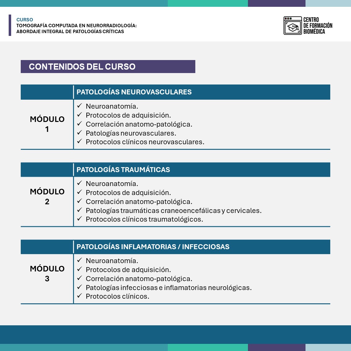 En este curso se realizará una revisión de las principales patologías críticas neurorradiológicas, identificando sus principales hallazgos tomográficos, involucrándose la clínica del paciente y recomendaciones de protocolos técnicos y clínicos según la presunta patología.